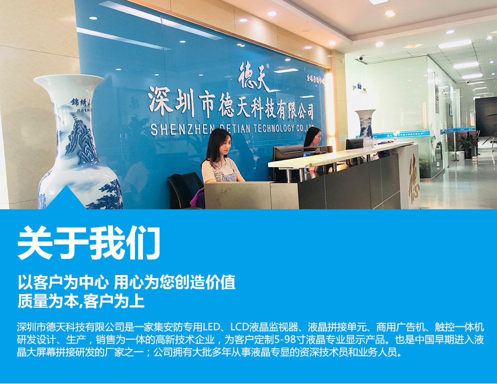 深圳市德天科技有限公司專注于安防LED,LCD液晶監視器,液晶拼接屏,公司擁有十年的生產經驗,擁有專業的生產技術和一流的生產團隊。在智能生活的浪潮中,我們也會堅守本心,專注品質,與時俱進,注重產品研發創新,將智能科技與液晶拼接屏技術充分結合起來,迎合廣大消費者的實際需求。